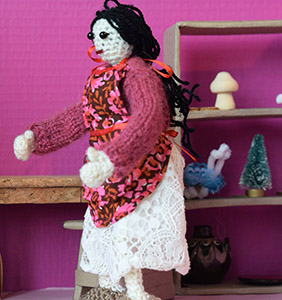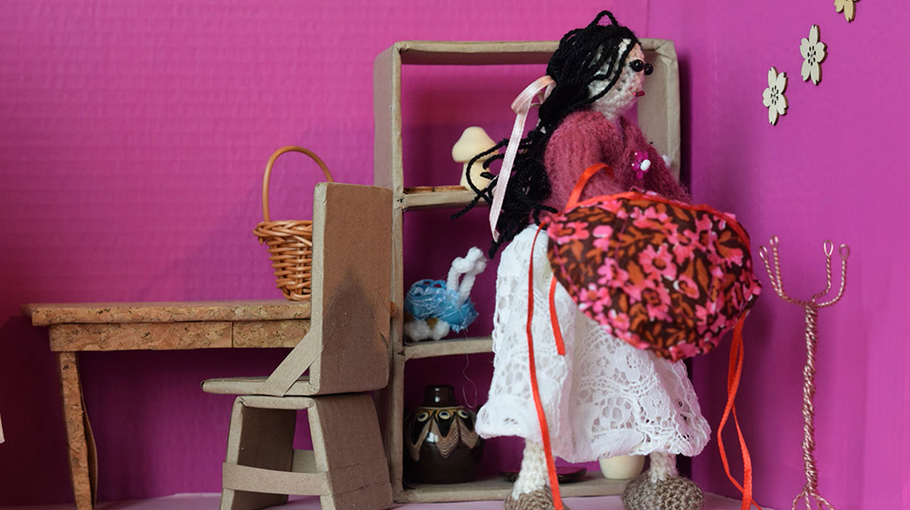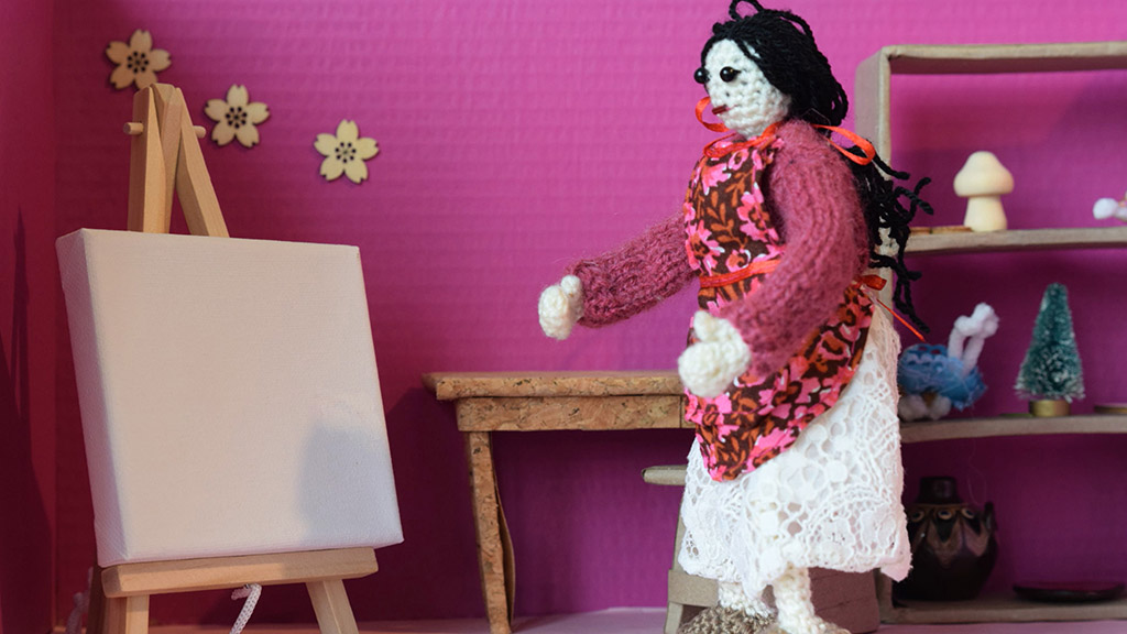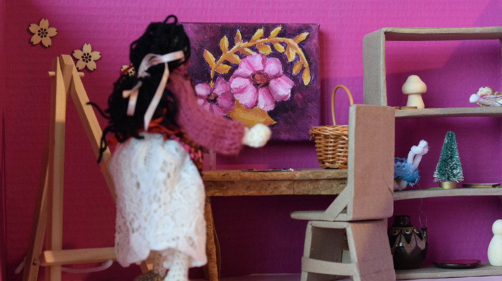 Wykorzystałam w niej wszystkie swoje umiejętności artystyczne. Pomysł miałam taki, by wykonać laleczkę, która będzie podchodzić do sztalugi i malować obraz. Najpierw zbudowałam laleczkę z drutu i szydełka. Ubranka dla niej wykonałam ręcznie. Kiedy laleczka była gotowa, zrobiłam pierwsze zdjęcia próbne. Następnie zbudowałam scenerię z kartonu, gdzie zostały umieszczone meble i sztaluga.