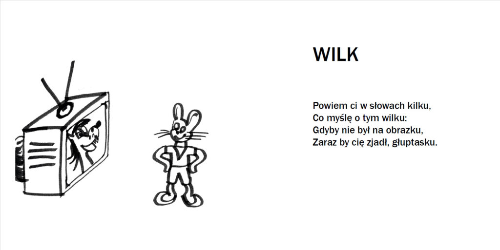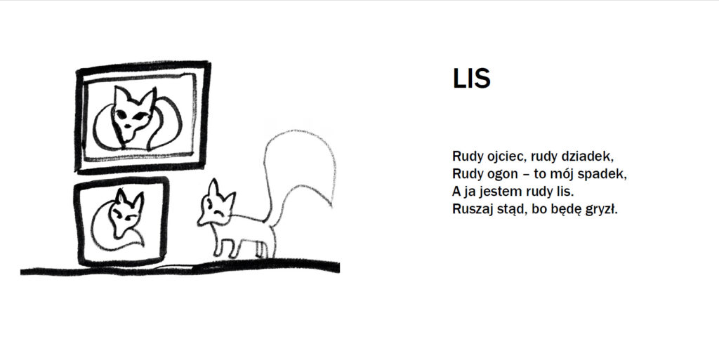 Ilustracje mogłam wykonać tak jak lubię czyli ręcznie rysowałam każdą z nich a że do każdego wiersza były potrzebne aż trzy to można powiedzieć że napracowałam się potrójnie. Ilustracje te też zostały potem wykorzystane w animacji, która powstała w ramach drugiej pracowni dyplomowej.
