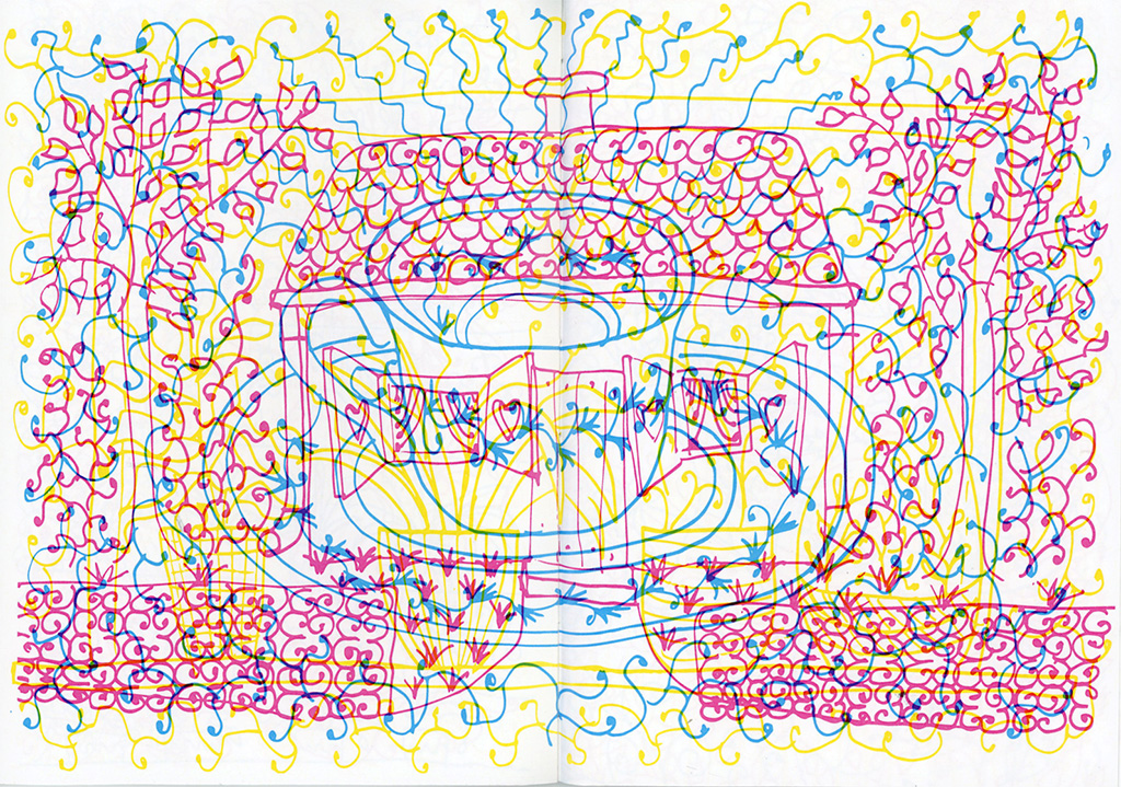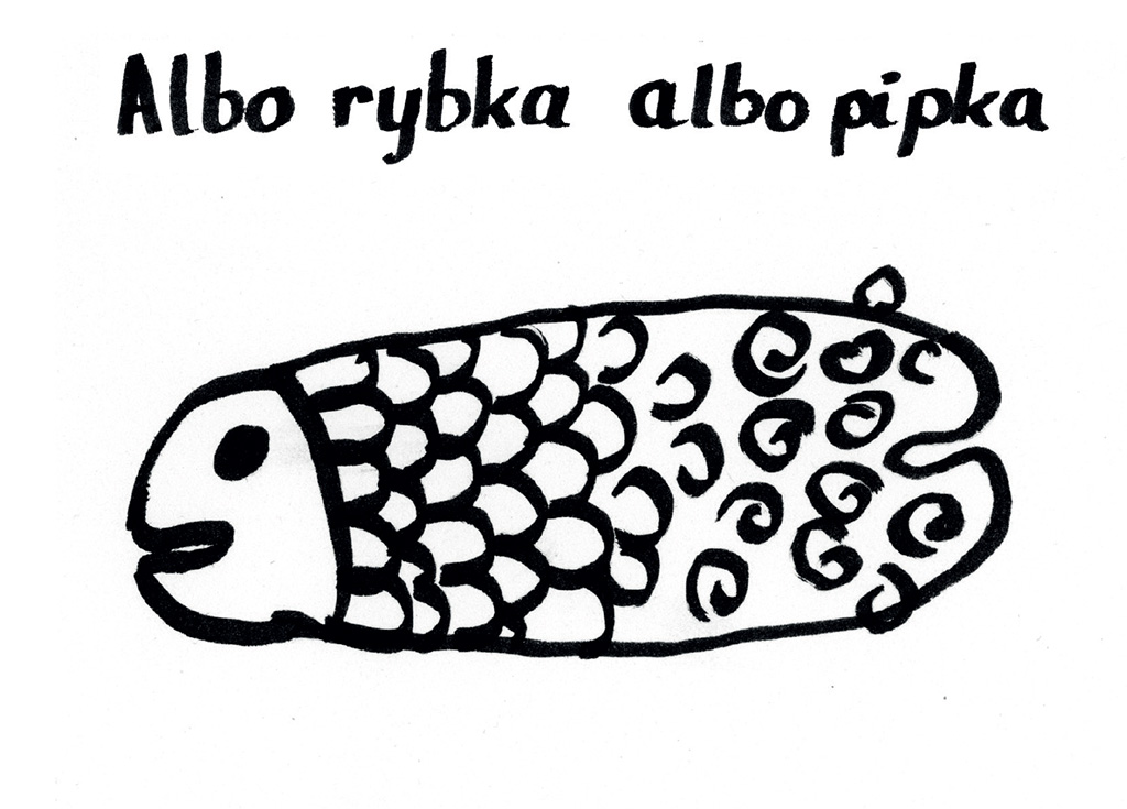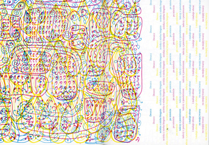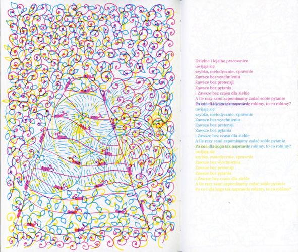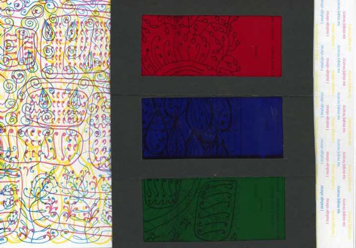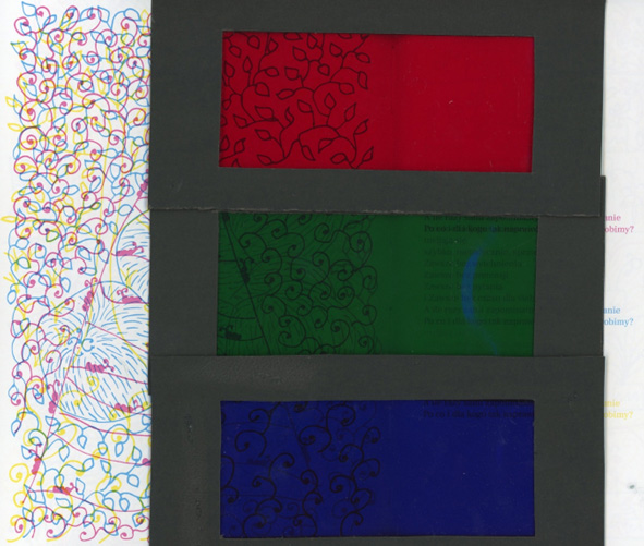Praca dyplomowa była jedyną okazją żeby poszaleć, więc zamiast planowanej tradycyjnej książki zrobiłam szaloną książkę ze swoimi ilustracjami do swoich wierszy. W dodatku każda ilustracja składa się z trzech rysunków nałożonych na siebie i ukazujących się dopiero po użyciu odpowiedniego filtru. Poza tym strony mają w niej różną wielkość.